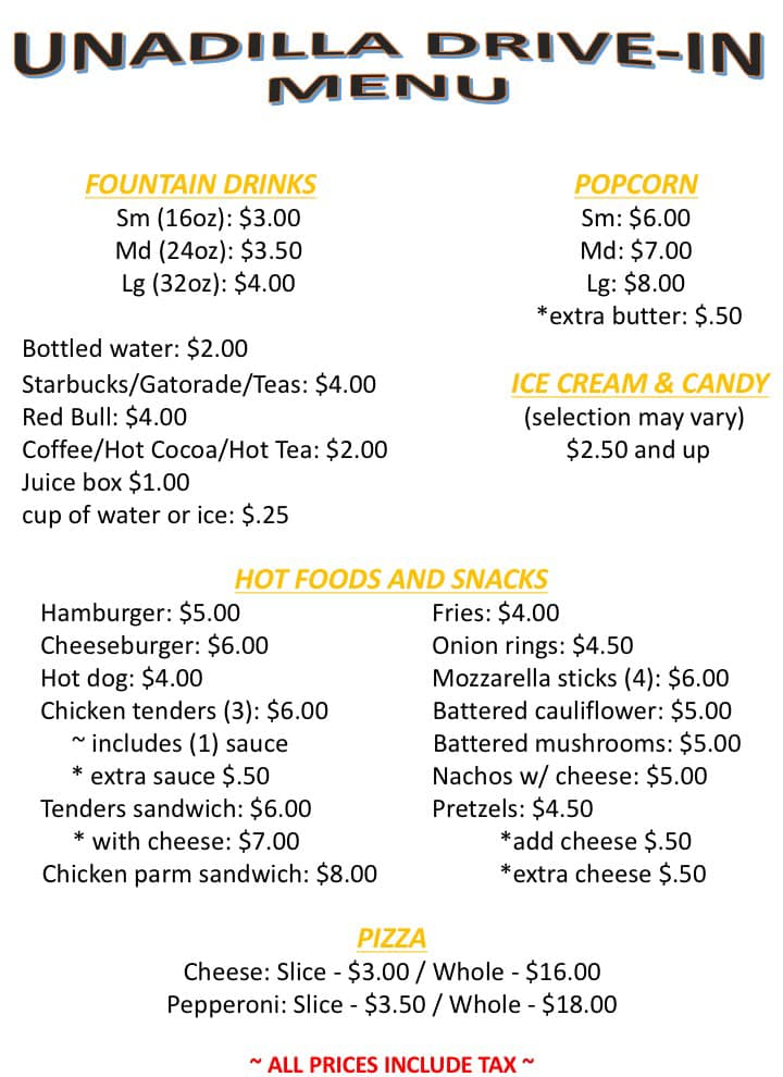Candy, Drinks, Popcorn, Hamburgers, French Fries, and more.